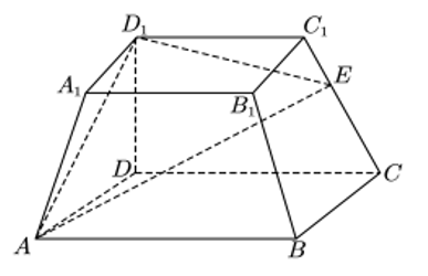 B. 若\(E\)为\(CC_1\)的中点,过\(A\),\(D_1\),\(E\)的平面把四棱台分成两部分时,较小部分与较大部分的体积之比为\(3: 5\)