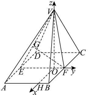 设平面 V A D 的法向量为 \vec{n}=\left(x_{2}, y_{2}, z_{2}\right) ,~~~~~~~~~\\则 \left\{\begin{array}{l}\vec{n} \cdot \overrightarrow{D A}=8 x_{2}=0 ~\\ \vec{n} \cdot \overrightarrow{V A}=4 x_{2}-3 y_{2}-\sqrt{15} z_{2}=0\end{array}\right. ,
