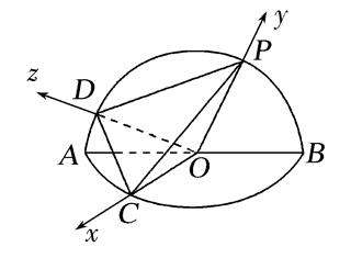 3.已知一圆形纸片的圆心为 O , 直径 A B=2 , 圆周上有 C, D 两点. 如图, O C \perp A B , ~~~~~~~~~~~\\ \angle A O D=\frac{\pi}{6} , 点 P 是 \stackrel\frown{BD} 上的动点沿 A B 将纸片折为直二面角, 并连接 P O, P D , P C, C D .\\